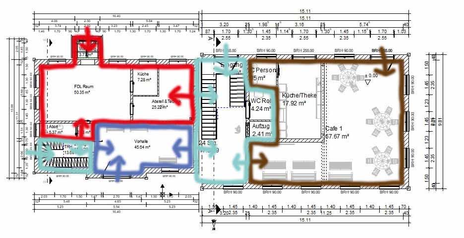 Wir möchten ein Gebäude planen, das bis auf die Räumlichkeiten im Dachgeschoss barrierefrei zugänglich ist.